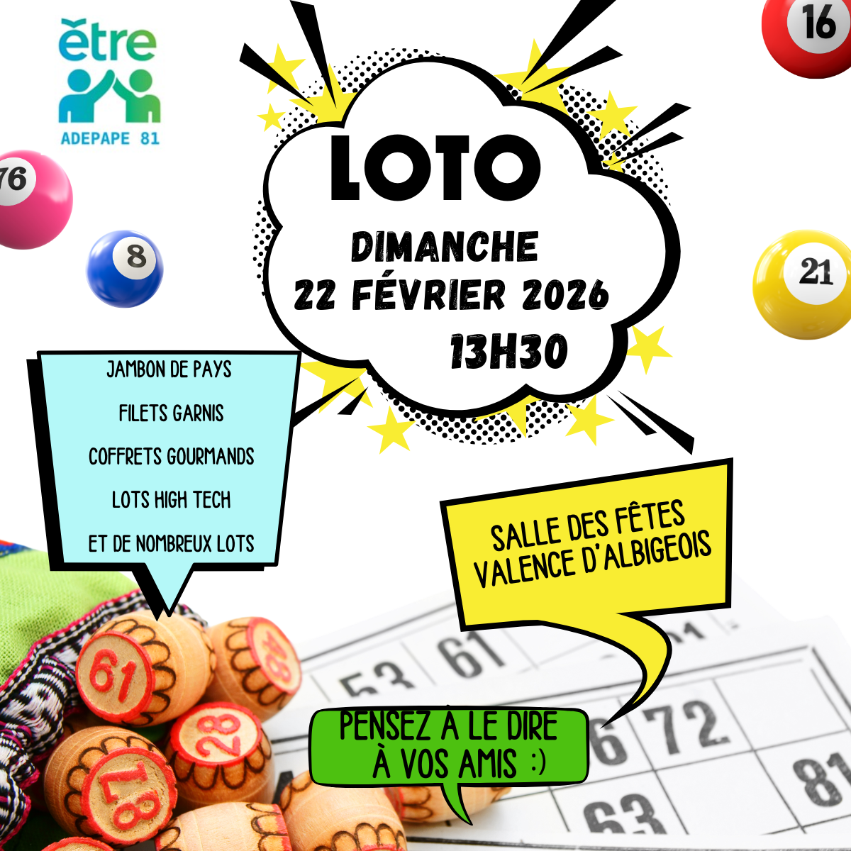 Nous vous donnons rendez-vous le dimanche 22 février à la salle des fêtes de Valence-d’Albigeois pour un loto.